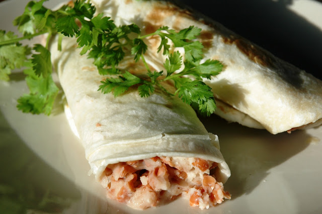Ciepla fasole lekko zmiksowac, dodac cebulke i posiekane cilantro. Zawijac w gotowe placki - tortillas. Mozna podgrzac lekko w piekarniku.