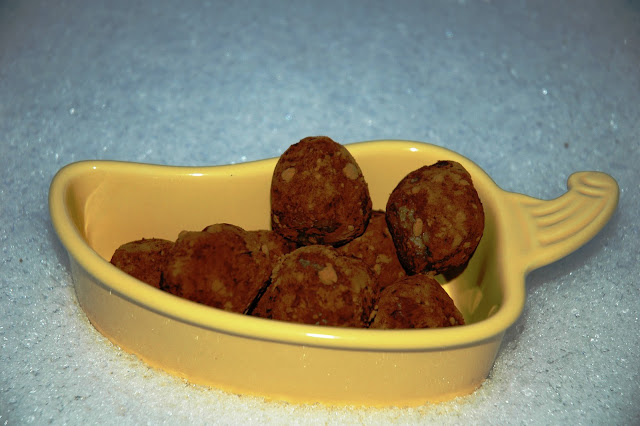 kwi10 TRUFLE Posted on Kwiecień 10, 2012 by Aga TRUFLE - 1 szkl orzechow wloskich - 2 lyzki kakao lub karobu - 4 lyzki oleju kokosowego (coconut oil) - 4 lyzki agave syropu i 1 lyzka melasy Orzechy namoczyc na kilka godzin. Wszystkie skladniki zmisowac, formowac kulki i obtaczac w kakao lub karobie.